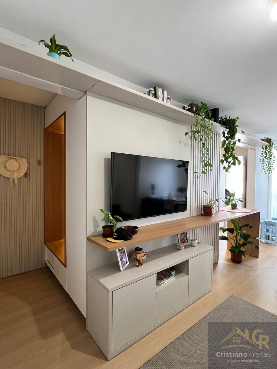 - Fica todos os móveis planejados, na cozinha ficam também o fogão cooktop, forno de embutir e depurador, além de lixeira e porta sabão embutidos